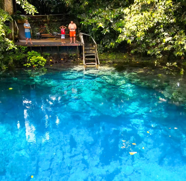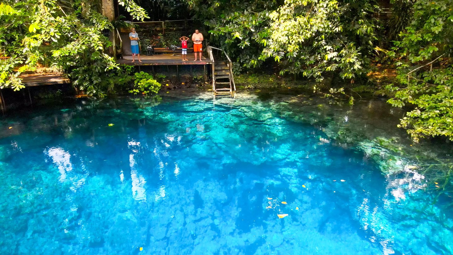 Le site est bien aménagé avec un snack, des toilettes propres, des douches, et le trou est entouré de plusieurs pontons en bois avec des escaliers pour descendre dans l'eau. L'eau y est particulièrement claire, au point que le fond, à plus de 10 mètres, est bien visible. Le trou se compose de deux parties, mais la seconde n'est pas accessible depuis notre côté. Un panneau indique que l'accès y est interdit, probablement géré par une autre famille.